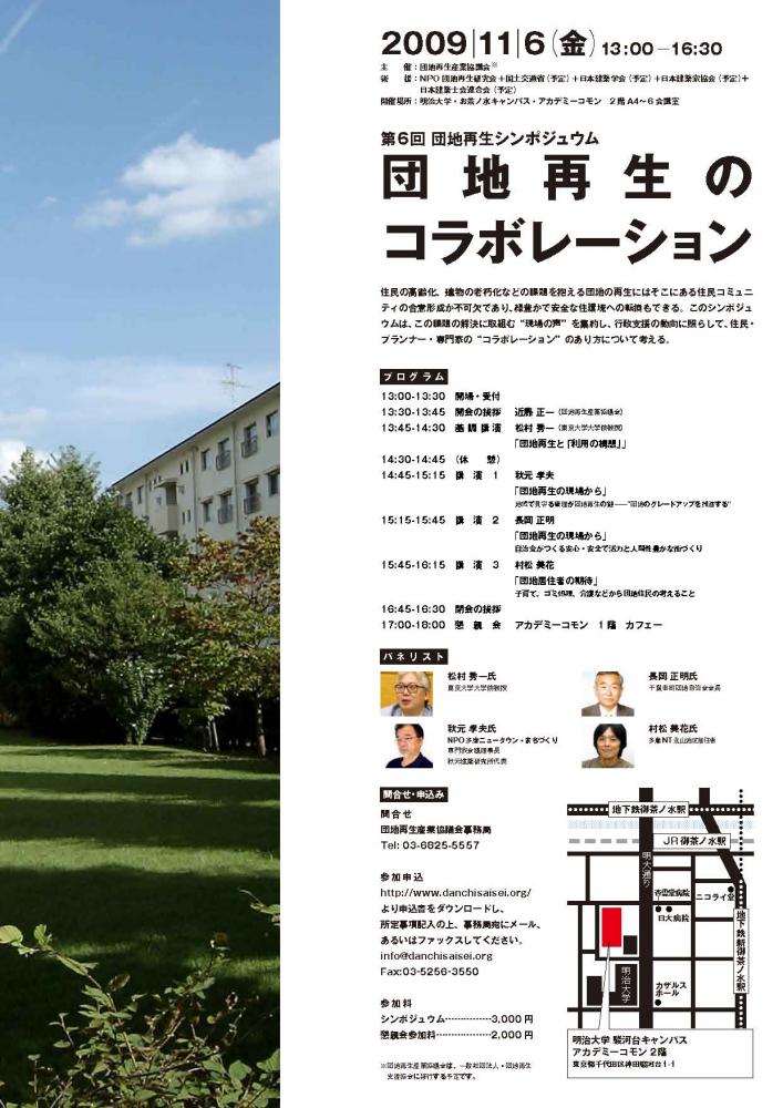 住民の高齢化、建物の老朽化などの課題を抱える団地の再生にはそこにある住民コミュニティの合意形成が不可欠であり、緑豊かで安全な住環境への転換もできる。このシンポジュウムは、この課題の解決に取組む“現場の声”を集約し、行政支援の動向に照らして、住民・プランナー・専門家の“コラボレーション”のあり方について考える。